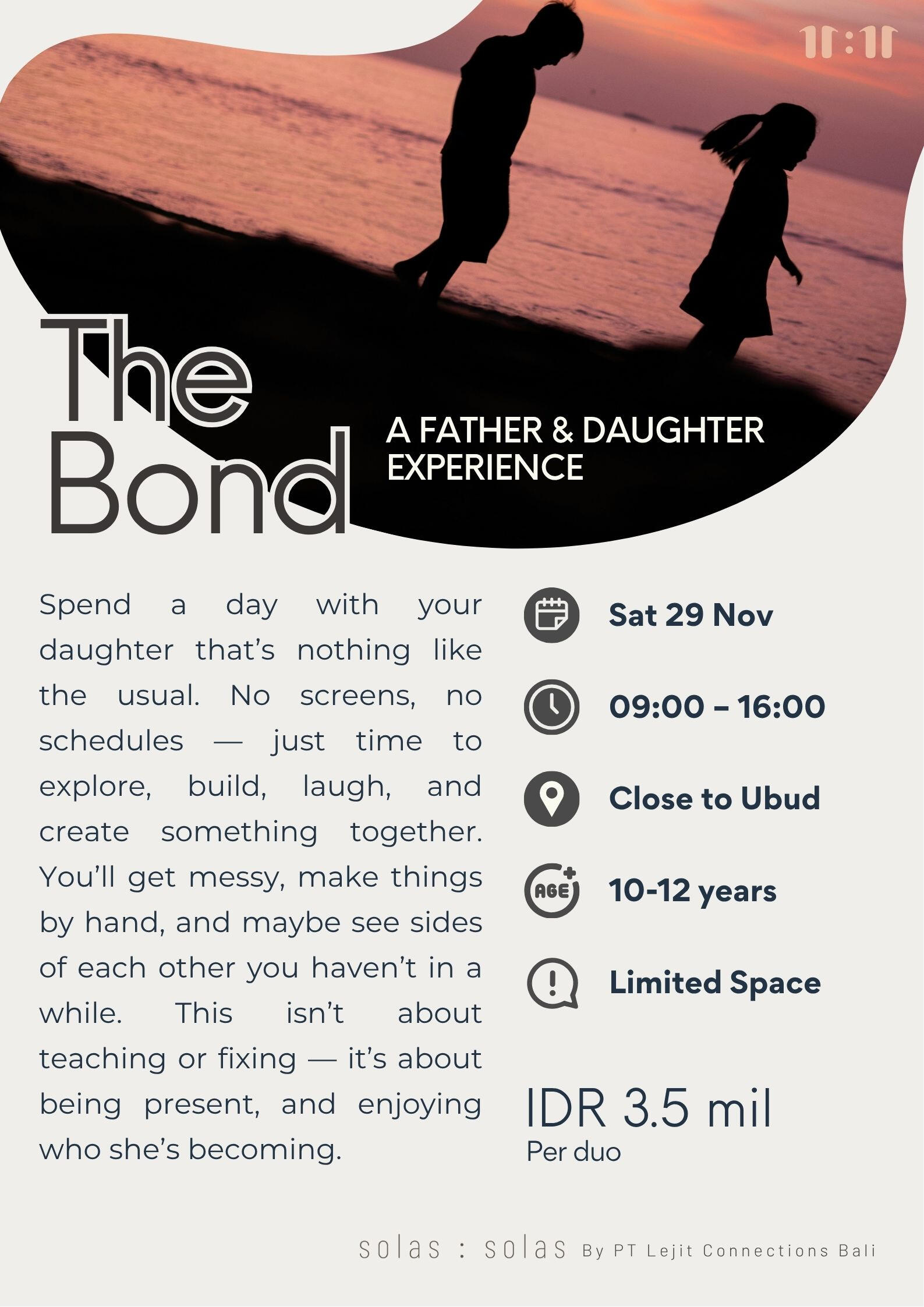 Solas : Solas creates private, design-led experiences for couples who need a breather from “doing life” and want to remember what it’s like to just be together.We’re based in Bali, but our approach is global—personalised, intentional, and a little bit unexpected.These are not therapy sessions. They're not awkward sharing circles. They're curated pauses. Think: private retreats, sunset picnics, hammam rituals, guided conversations, and playful escapes backed by real relationship science (Gottman-certified, if you're wondering).